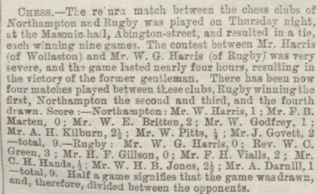 But that opportunity was never offered him. He continued farming for the rest of his life, and also playing chess, often on top board for Northampton: here, as reported in the Northampton Mercury of 20 March 1880, beating his Rugby namesake William George Harris, a Welsh born schoolteacher.