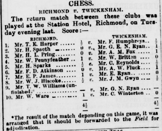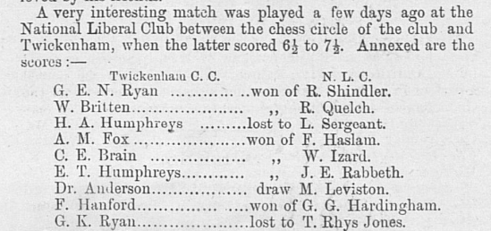 You’ll observe that two of his sons, E Ryan (probably Ernest Keating Woods Ryan rather than Edward Francis Maxwell Ryan, who had married and moved out of the immediate area) and George Norwood Ryan, were also playing. George junior would later cross the river to Kingston and change his allegiance to Surbiton Chess Club in the first decade of the 20th century.
