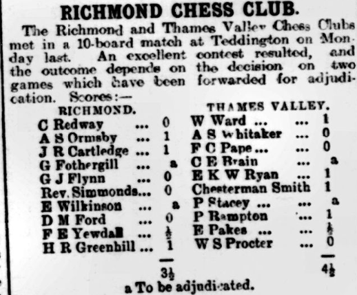 Here, we see that he had now joined Thames Valley Chess Club, here facing a teammate from five years earlier. Press reports of the 1908 cable match also describe him as being of Thames Valley Chess Club. (The Thames Valley Board 3, Frank Cheyne Papé, was a famous artist and illustator, whose son Lionel would play junior chess successfully in the 1920s.)