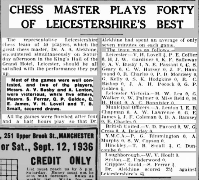 On 5 September Stanley Ferrar was selected as one of 40 players to take on the great Alexander Alekhine in a simultaneous display.