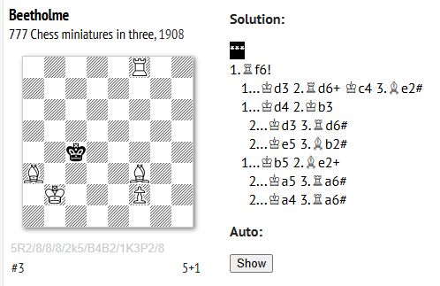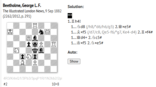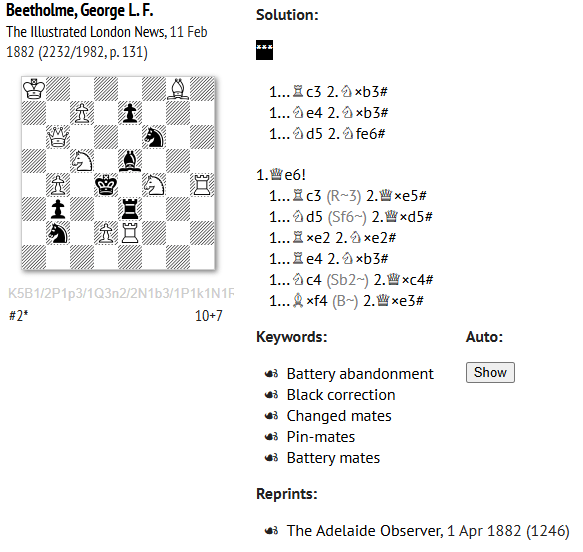 I have an interest (I’ll explain more later) in the very rare, and now, I believe extinct, at least in that form, name BEETHOLME. I randomly typed ‘Beetholme chess’ into Google and discovered that one of their number, George Law Francis Beetholme, was a published problemist.