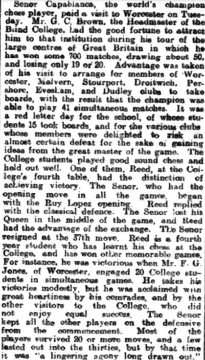 Sadly, Reed’s game hasn’t survived, but this one has. Capa’s Stourport opponent might be considered rather unlucky to lose, having had the better of things most of the game. Click here and paste the pgn if you’d like to play through any game in this article online.