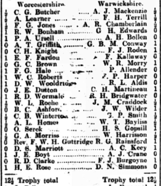 On 7 February 1931 Worcester College hosted a 100 board match between Worcestershire and Warwickshire. The top 25 boards counted towards the South Midlands County Championship.