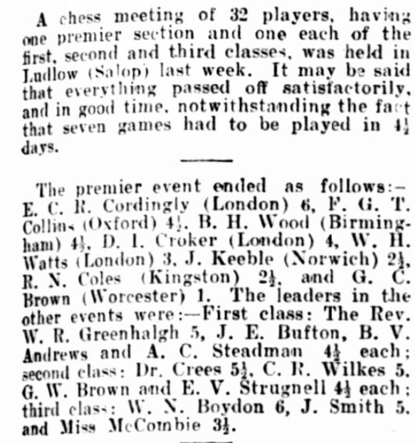 In August 1935 George Clifford Brown took part in a small tournament in Ludlow. Playing in the top section, his opponents included future chess author and historian R Nevil Coles, whom I played many years later.
