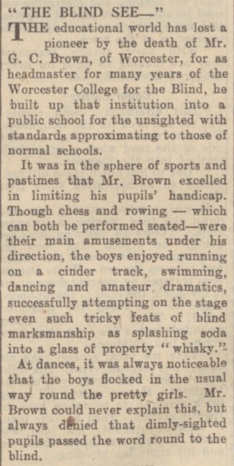 George Clifford Brown was a remarkable man who, although, like all of us, he had his faults, undoubtedly transformed the lives of many boys who were blind or had limited vision during his 25 year tenure as Headmaster of Worcester College. His opinion that chess is something which can help young people with disabilities integrate into the outside world is something that we’ve perhaps forgotten today. He would, I think, be saddened to see how, a hundred years later, so few children with visual handicaps seem to play the game.