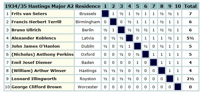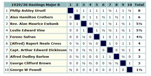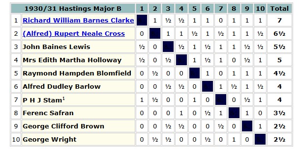 That winter Brown ventured to Hastings for the first time, scoring 3/9 in the Major B section, where he lost to his pupil Rupert Cross, and drew with the previously mentioned Alfred Barlow.