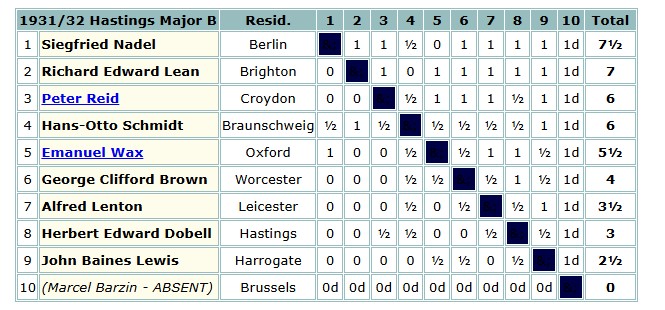 He was back again at Hastings, again in the Major B section, over the 1931-32 New Year, where his opponents included my distant kinsman Alfred Lenton.