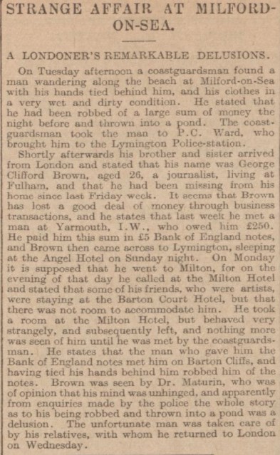George Clifford Brown was born on 29 May 1879, the son of a chemist and pharmacist from Brading on the Isle of Wight. His paternal grandfather, though, had been a master mariner from Yorkshire. In the 1901 census he, along with his brother John, was a pupil at Solent College in Lymington, just a short ferry ride from Yarmouth, on the other side of the Isle of Wight from Brading. By 1901 he was teaching at Shoreham Grammar School, on the Sussex coast, but he seems not to have stayed there long.