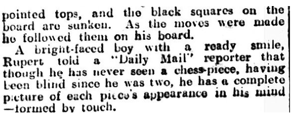 The Staffordshire Advertiser (10 January 1925) published this game between the two youngest players, commenting that it is a really excellent game when considering that Rupert Cross is a blind boy, and has to play with board and pieces specially made for the blind.