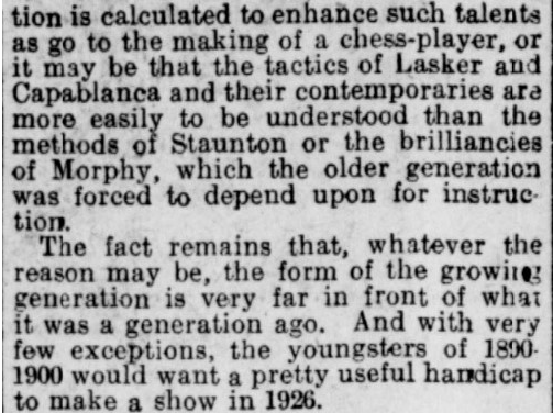 The Daily Chronicle managed to get a lot wrong. Rupert had, of course, competed for the London Championship before, and it also seems rather odd to describe Capablanca as imaginative rather than scientific. The sub-editor writing the headline seems to have made the mistaken assumption that this was a knock-out competition.