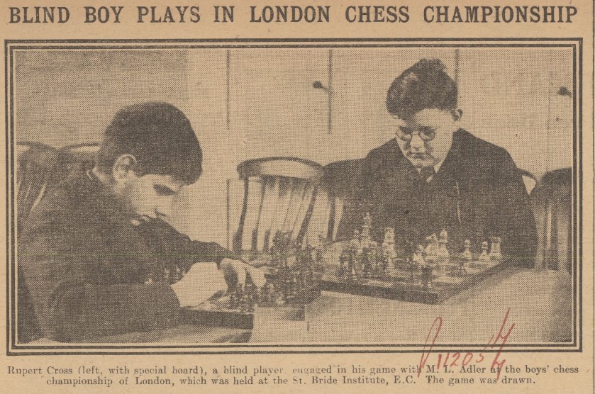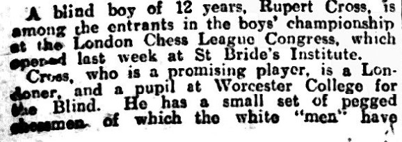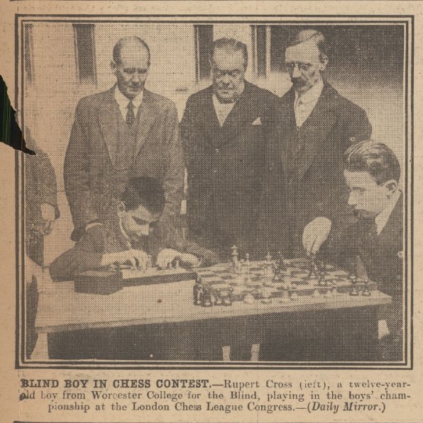 One of the newcomers in particular attracted a lot of press attention. This was the young blind player Alfred Rupert Neale Cross (1912-1980), known as Rupert, a pupil at Worcester College for the Blind.
