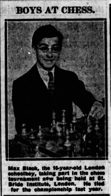 We can see here bright boys from lower middle or working class backgrounds who were winning scholarships to grammar schools, and sometimes then continuing their studies at London University. There was now a schools chess league in London: if you were fortunate enough to attend a school where one of the masters was interested in chess, a club would be set up, matches would be played against other schools, and you’d be encouraged to take part in competitions such as this. I note that my old school, Latymer Upper, wasn’t playing chess at this time, but its local rival, St Paul’s, and my local grammar school, Hampton Grammar, were both strongly represented in boys’ chess tournaments in the inter-war years.