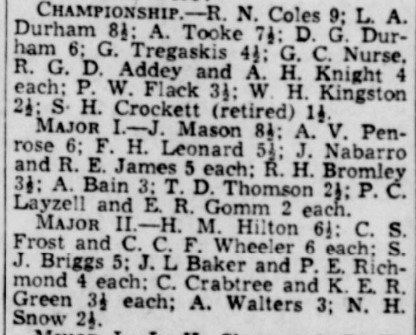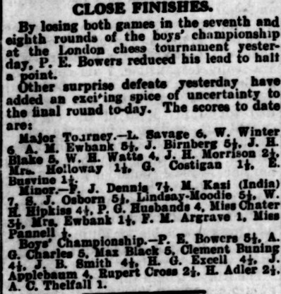 The Daily News didn’t publish the full final results, but we know that Bowers, Black and Charles all finished on 6/9 (or perhaps 6½/9: sources differ), with Excell and Smith on 5½/9, and that Cross finished on 3/9.