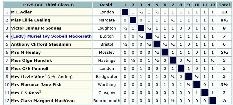 You’ll see he scored a convincing victory against a field including future BCF President Vic Soanes and Vera Menchik’s sister. You’ll also note with interest that nine of the 12 players in this section were female.