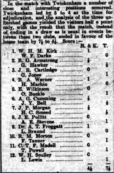 He also joined Twickenham Chess Club, in this match against Richmond & Kew, playing on top board against Wilfred Kirk.