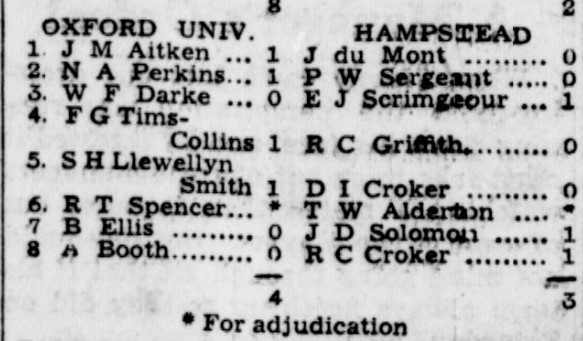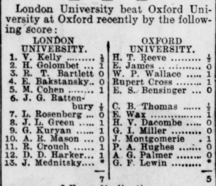 On leaving Hampton Grammar, William continued his studies – and his chess at London University. In this match Harry Golombek was unexpectedly beaten by George Tregaskis on top board.