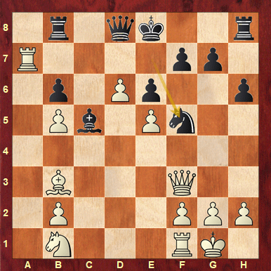 White against JP Blank, the game continued 14. h5 (missing 14. Bxb5 cxb5 Qd5+) 14… Qa5 15. Kb1 (again Bxb5 worked) 15… Nb6, allowing another Stock Tactic, which this time Gifford found: 16. Nd5 Qxd2 17. Nxe7+ Kf7 18. Rxd2 Kxe7 19. e5 fxe5 20. fxe5 dxe5 21. Bc5+.
