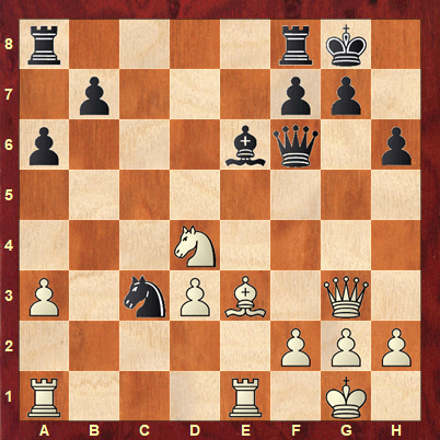 The obvious 42… Qxf1 offers equal chances according to Stockfish, but he tried for more with 42… Nf2, overlooking that 43. Ng3, ready to capture if Black plays Ne4 at any point, refuted his idea, leaving Mason a piece ahead.