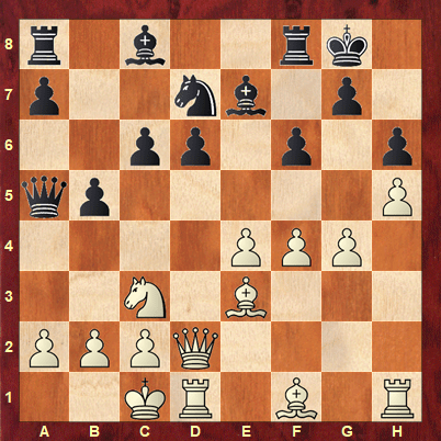 1. d4 b6 2. e4 Bb7 3. Nc3 e6 4. a3 Nf6 5. Bf4 Bxe4 6. f3 Bc6 7. Bd3 Nd5 8. Nxd5 Bxd5 9. c4 Bc6 10. Qc2 d5 11. O-O-O Qd7 12. cxd5 Qxd5 13. Be4 Qd7 14. d5 exd5