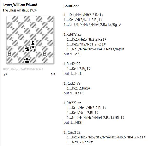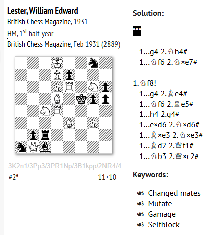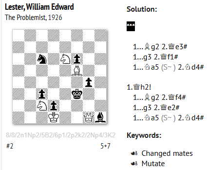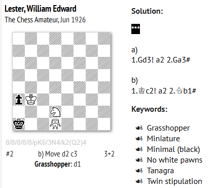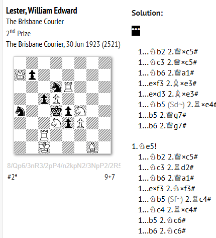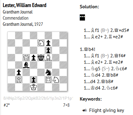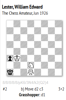 By now, Lester had struck up a friendship with the great Thomas Rayner Dawson, and developed an interest in Fairy Chess (using different pieces or stipulations) problems.