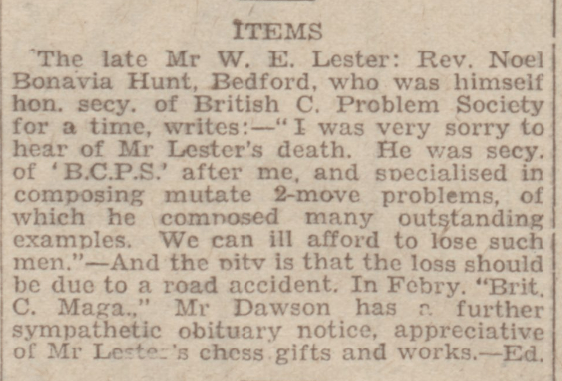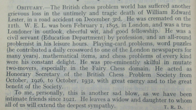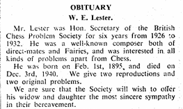 In 1927, following the resignation of the Rev Noel Bonavia-Hunt, Lester was appointed Secretary of the British Chess Problem Society, a tribute to his organisational ability. He was also giving lectures to the society members, demonstrating his favourite problems.
