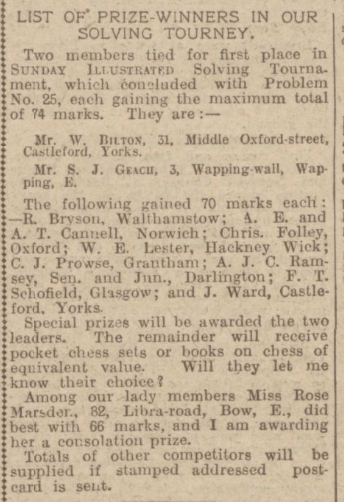 The story of William and Rose is one of social mobility. William Lester grew up in one of London’s poorest streets, the grandson of a German immigrant, but became a leading light of the British Chess Problem Society, a ‘true Londoner’, renowned for his ‘cheerful wit’ and ‘good fellowship’. He would have been drawn to chess, perhaps, by the problems regularly published in newspapers at the time, and it was the puzzle element rather than the competitive element that appealed to him most about our wonderful game. He was also able to share his love of chess problems – and crosswords – with his wife, who herself became a published problemist.