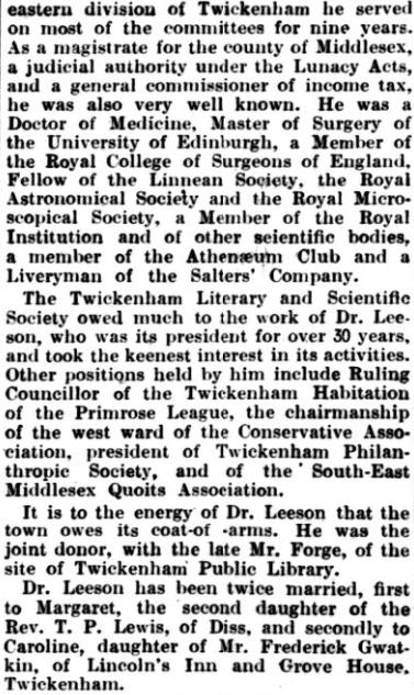 An admirable life, it would appear, and typical of his time: an affluent man who was able to devote his considerable abilities to public service. In an urban area such as Twickenham you would find many like him who were, in many ways the mainstays of society, supporting local organisations as well as helping those less fortunate than themselves. Sadly, community-minded, public spirited people like Dr John Rudd Leeson seem to have become a dying, perhaps an extinct breed.