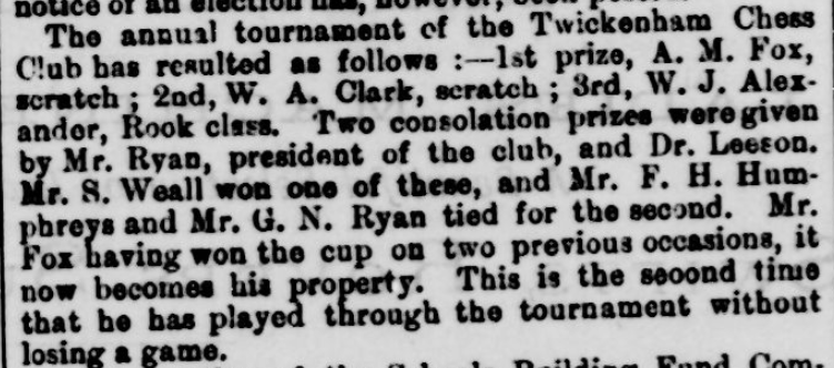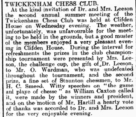 Here he is, in 1895, donating a prize for the Twickenham Club Championship, the year before they moved to Teddington, changing their name to the Thames Valley Chess Club.