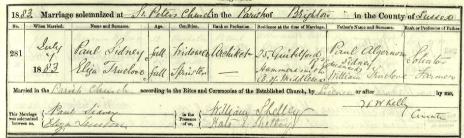 I haven’t yet been able to locate Eliza in the 1881 census, but we can find her in Brighton, in 1883, where she married a widower, Paul Sidney.