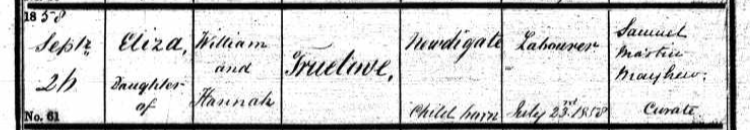 Unlike Miss Doolittle, Miss Truelove was a country girl. She was born on 23 July 1858, in the Surrey village of Newdigate, situated to the west of what is now Gatwick Airport.