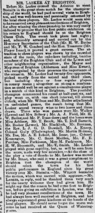 Mrs Sidney’s determination to master the difficulties of chess led to lessons with Rev George Alcock MacDonell. When Lasker was in town in 1894 it was clear that they’d paid off.