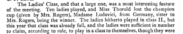 In 1895 she took part in the Major section of the Ladies’ Tournament at Hastings.