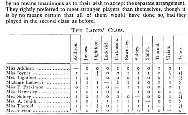 That autumn, Mrs Sidney travelled to Salisbury for the Southern Counties Chess Union congress, taking part in the Ladies’ Tournament. (Note that ‘Miss Watson’ should read ‘Mrs Rumboll’.)