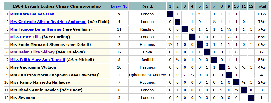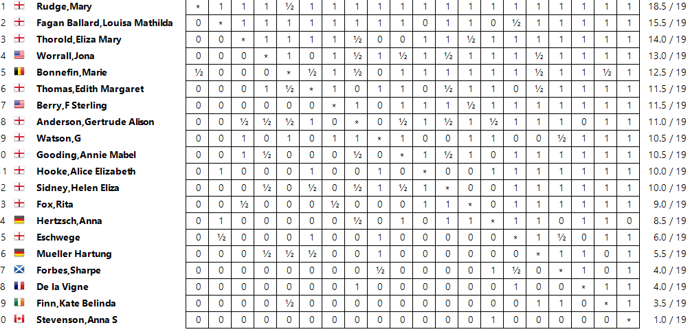 You’ll see from the crosstable that she performed respectably, scoring 10/19, just half a point below Annie Mabel Gooding and level with Alice Elizabeth Hooke.