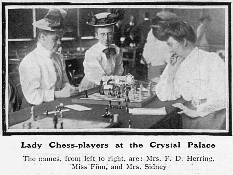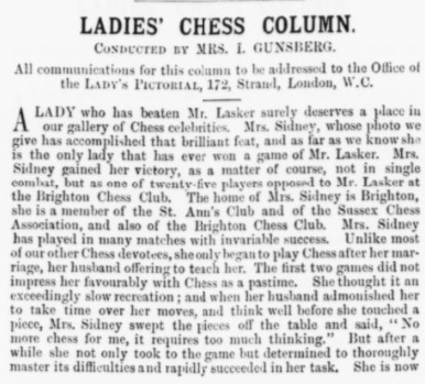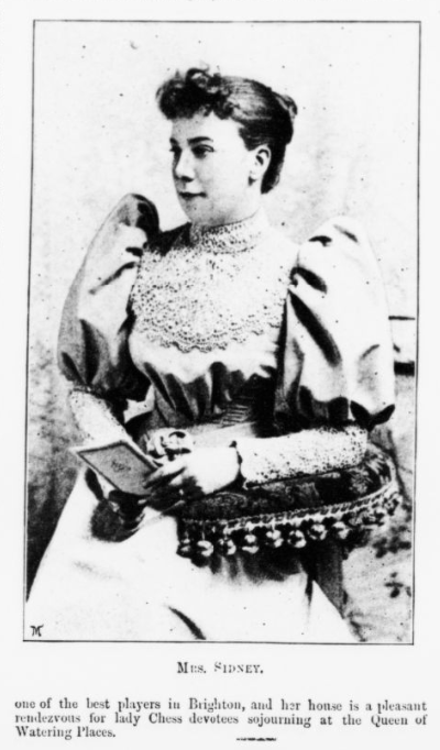 … she only began to play Chess after her marriage [in 1883], her husband offering to teach her. The first two games did not impress her favourably with Chess as a pastime. She thought it an exceedingly slow recreation; and when her husband admonished her to take time over her moves, and think well before she touched a piece, Mrs. Sidney swept the pieces off the table and said, “No more chess for me, it requires too much thinking.” But after a while she not only took to the game but determined to thoroughly master its difficulties and rapidly succeeded in her task