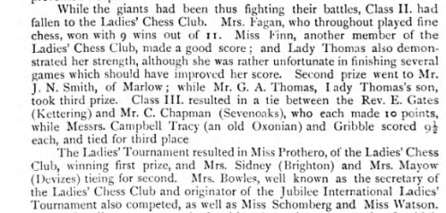 This was a great period for women’s chess in England, with leading players such as Mrs Fagan playing successfully in open competition. Sadly, Miss Prothero, the winner of the Ladies’ Tournament, died just a year later.