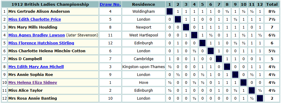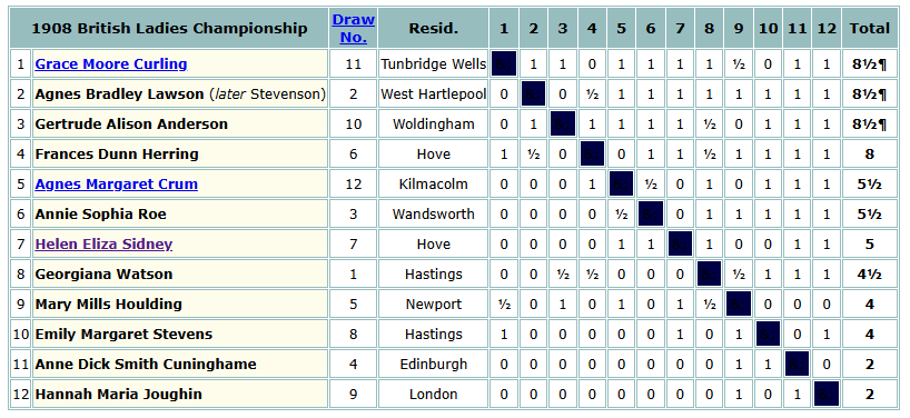She was less successful in Tunbridge Wells in 1908, by which time she had played 35 decisive games in the British Ladies Championship, suggesting an aggressive and uncompromising playing style.