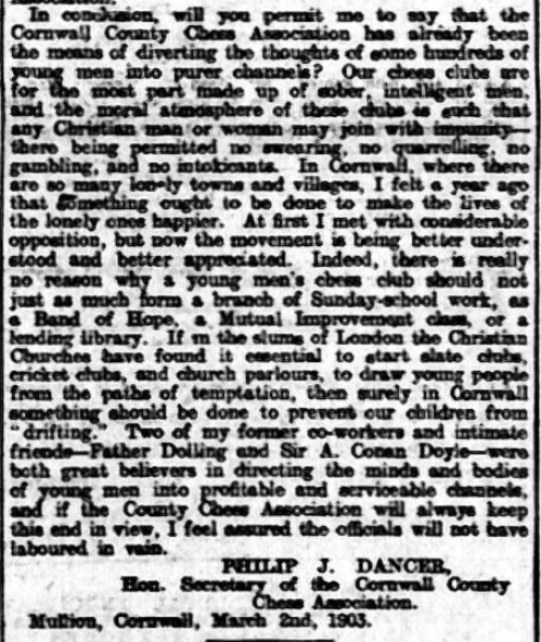 Chess, he claimed attracted ‘sober, intelligent men’ with ‘no swearing, no quarrelling, no gambling, and no intoxication’. ‘In Cornwall’, he added, ‘where there are so many lonely towns and villages, I felt a year ago that something ought to be done to make the lives of the lonely ones happier.’
