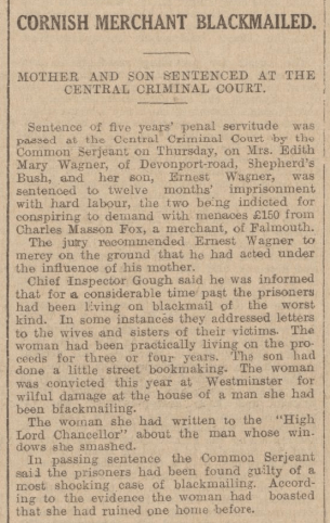 Edith and Ernest were both found guilty: Edith received five years in prison, and Ernest one year with hard labour. This report provides evidence that they’d been making a living out of blackmail for several years.