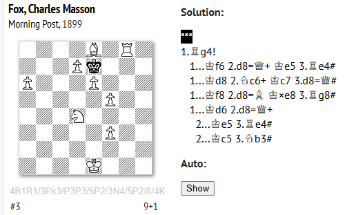 Fox had always had an interest in chess problems, having this mate in 3 published in 1899. You’ll find the solutions to all problems at the foot of the article: note that helpmate solutions start conventionally with a black move.