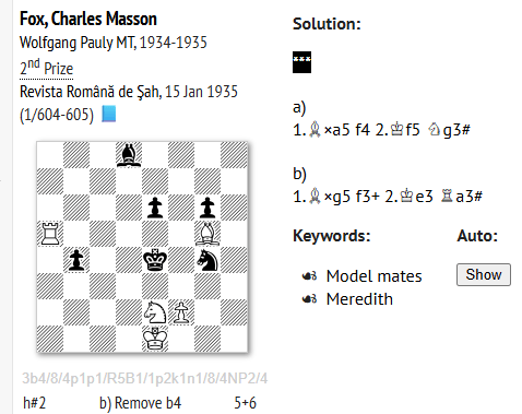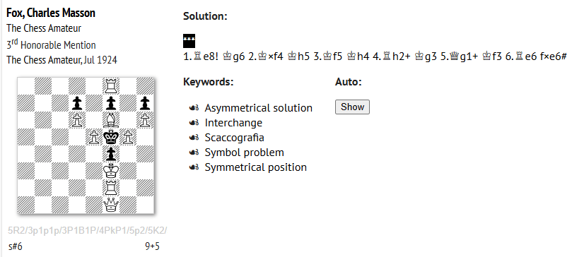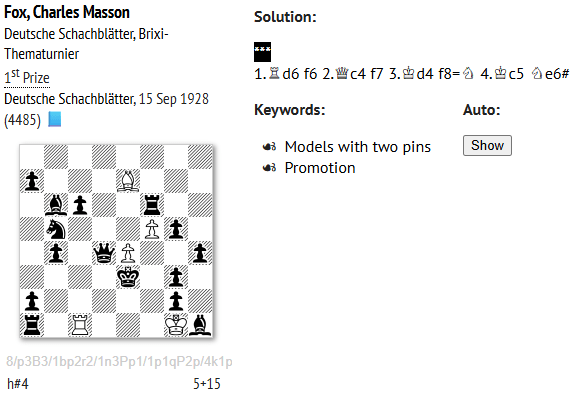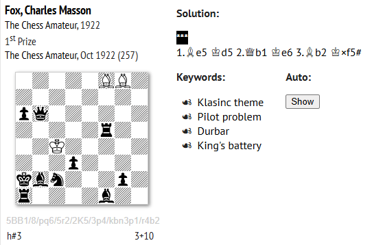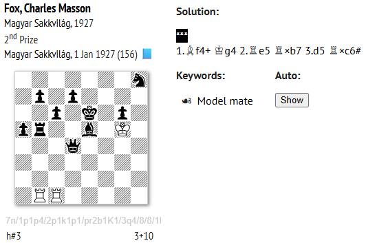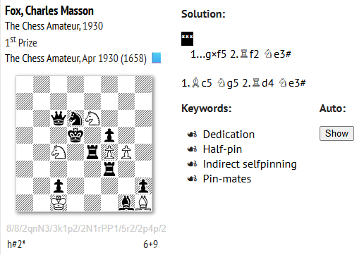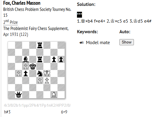 The formation of the British Chess Problem Society in 1918, followed by the launch of their magazine The Problemist in 1926 did much to develop a community of problemists, and through this Charles Masson Fox formed a close friendship with the great Thomas Rayner Dawson.