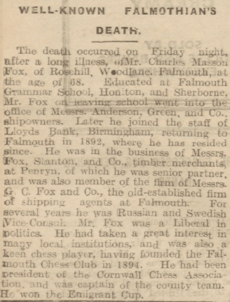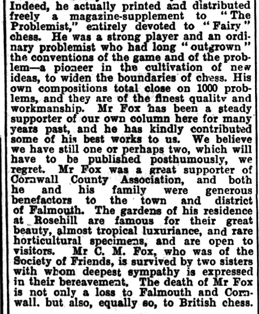 Howard, who was involved in the family shipping business, married Olivia Blanche Orme: their children were Howard Orme Fox, Charles Masson Fox, Olivia Lloyd Fox and Stella Fox. As the second son, Charles’s responsibility was the family timber merchants, although he was also on the board of the shipping business. Born on 9 November 1866 he was a pioneer of chess in Cornwall as a young man, and, in the last decade of his life, a pioneer chess problemist.