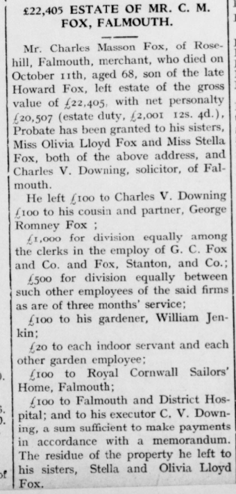 Charles Masson Fox died at the age of 68 on 11 October 1935, after a long illness.