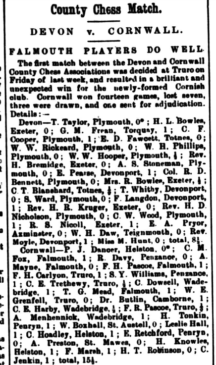 Chess in Cornwall continued in the same way over the next few years: club matches and county matches, both over the board and by correspondence.
