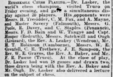 In the far south west of England, Cornwall has always been a long way from the main centres of chess. It wasn’t until 1893 that Falmouth had a chess club.
